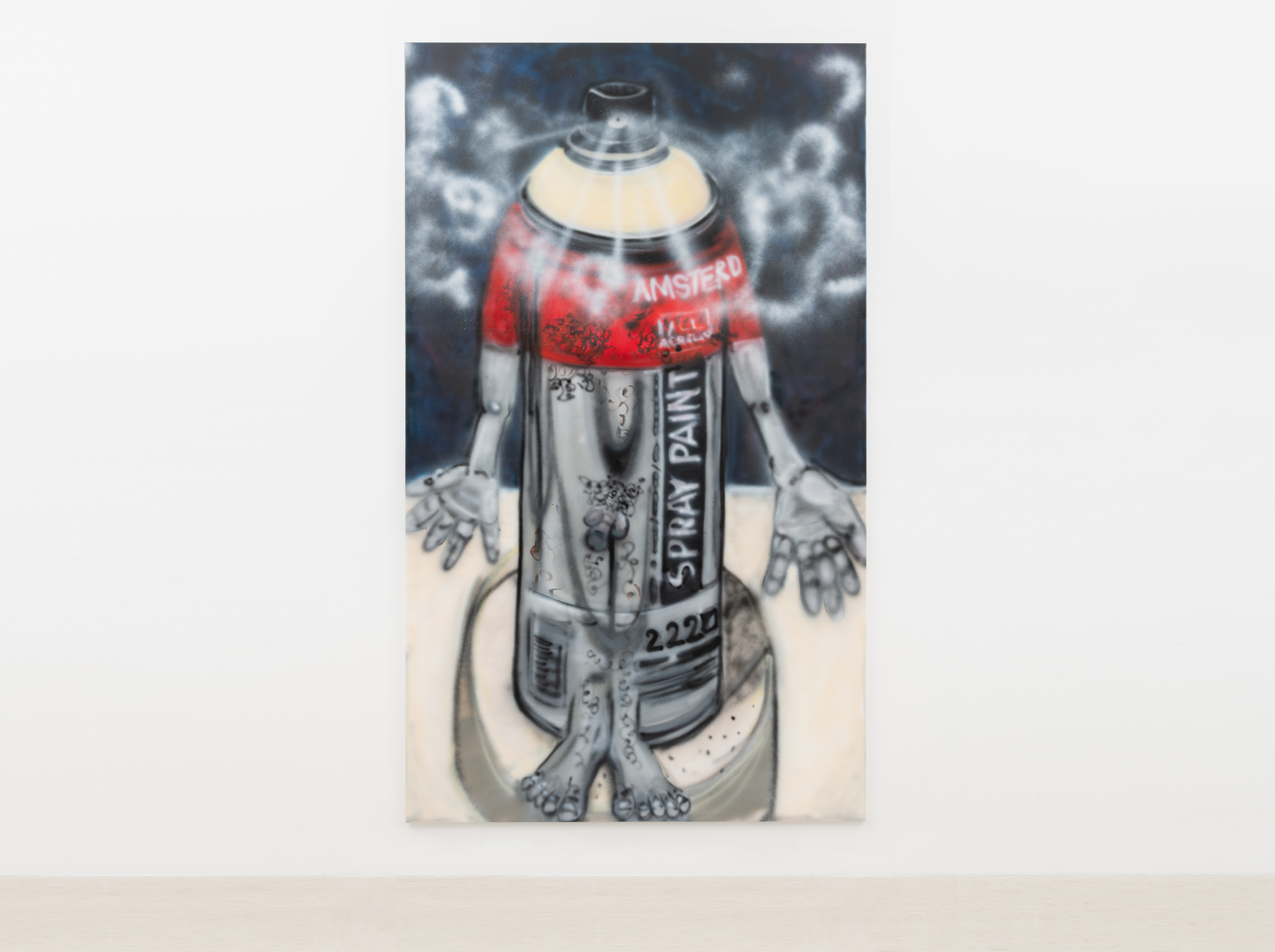 Euler manipulates the conventions of figuration to find new outlets for painterly realism. Houston’s presence in Whitney (2013), for instance, signals Euler’s interest in the social construction of image and taste—in the networks of the art world as well as those of mass culture. The title duly refers to the New York museum which commissioned it for a two-person exhibition, and which appears as a specter abutting the face of the singer. Another series of works in which spray cans or brushes paint themselves allows artist and object to swap roles, skewering the expectations of mastery or control that accompany studio practice. And Euler’s work has long been attuned to the impact of art’s conventions on the body, human and otherwise. The figures in paintings such as Human Size (2014) or Venice void (2022)—or the tangled nudes in her 2020 Artists Space exhibition Unform—contort themselves to fit rectangular frames, as if documenting the biological impact of art’s structures writ large.