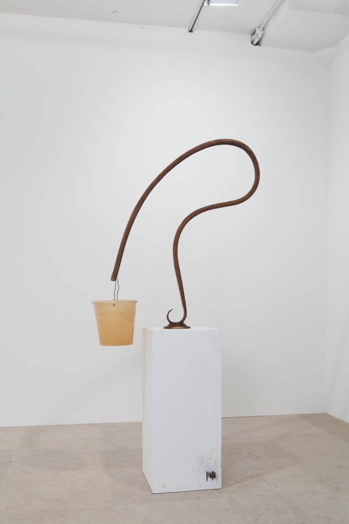 The sculptures themselves combine earthy, distinctly recovered objects and vibrant, brightly colored elements with a comic flair. The viewer first enters the space to see an elegant yet uncanny sculpture – upon a curling fragment of old furniture hangs a worn bucket, the arrangement’s silhouette gracefully echoed on the gallery walls.