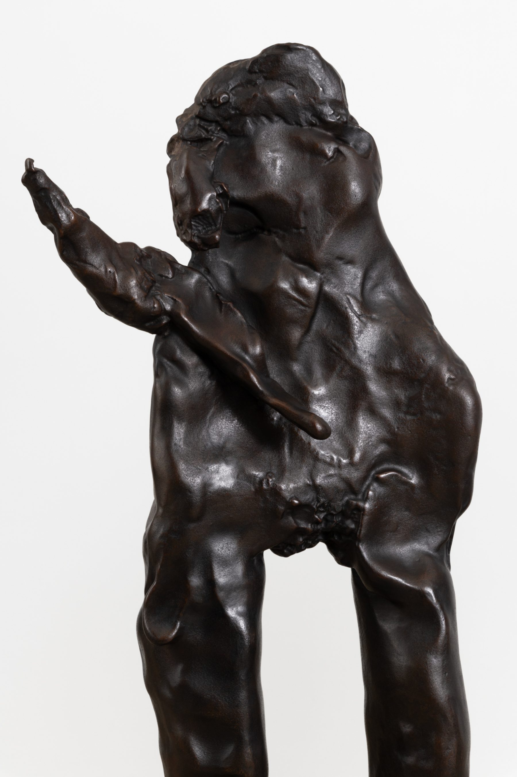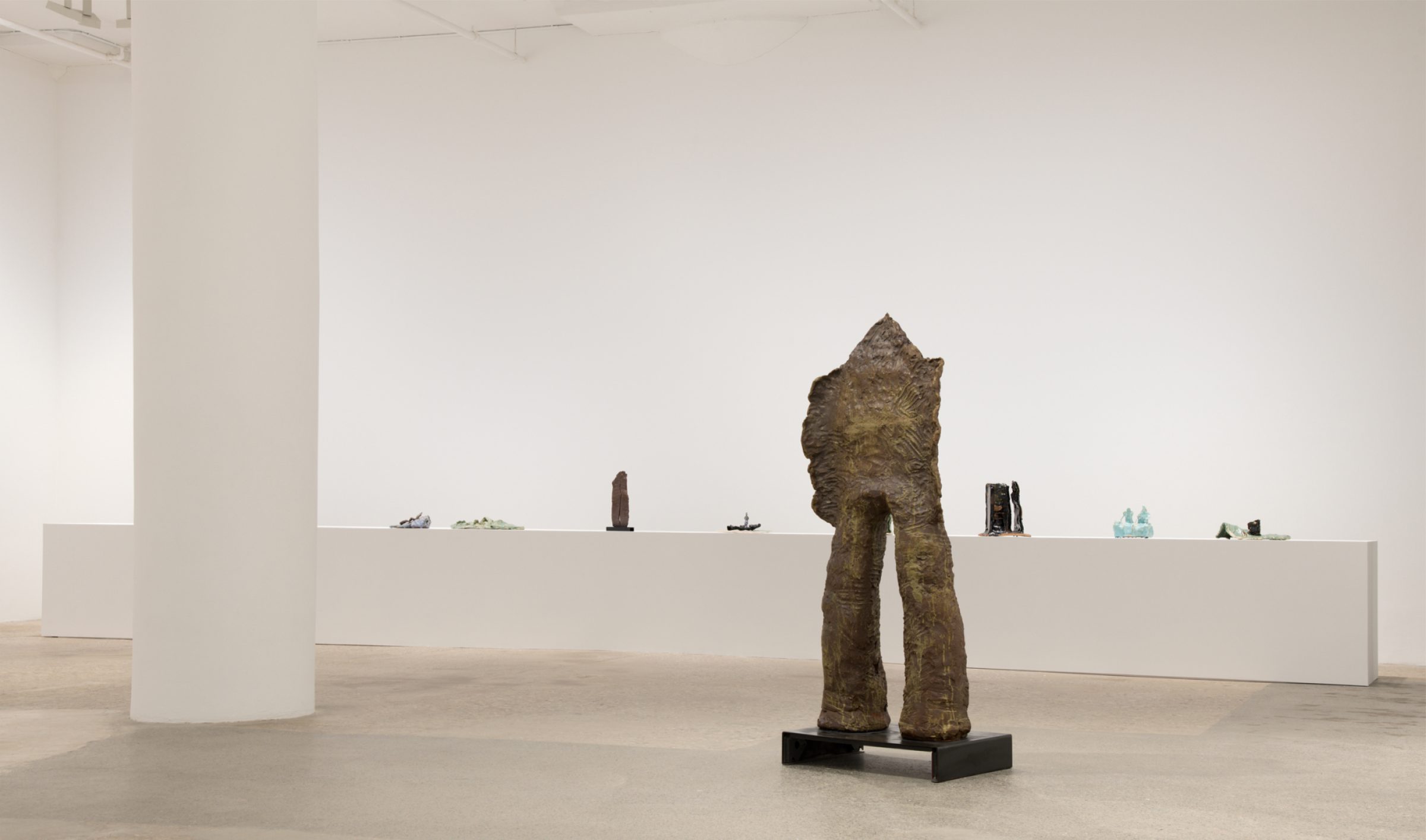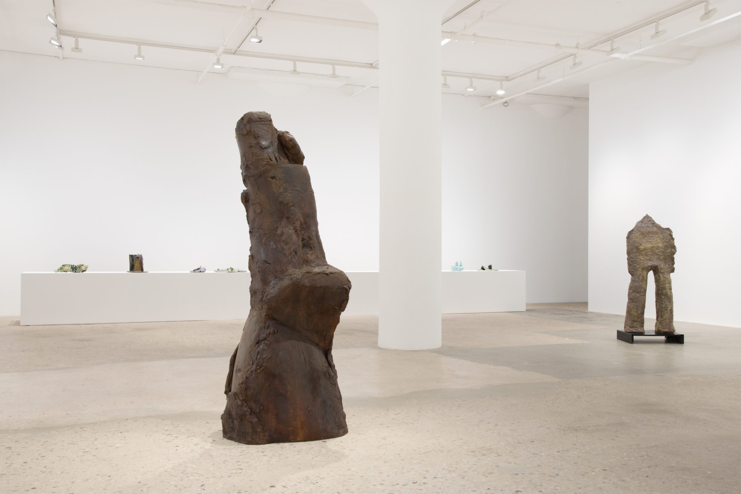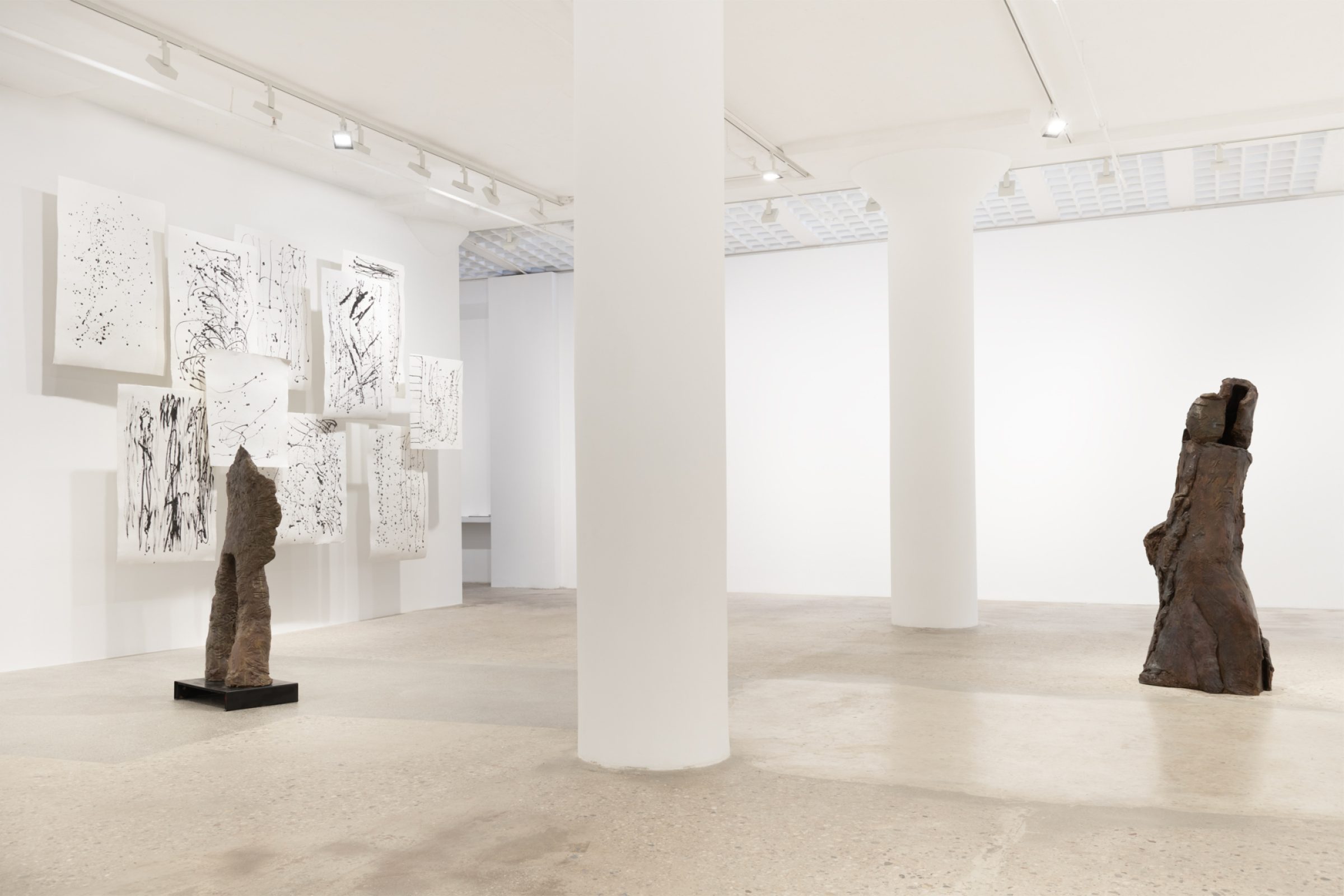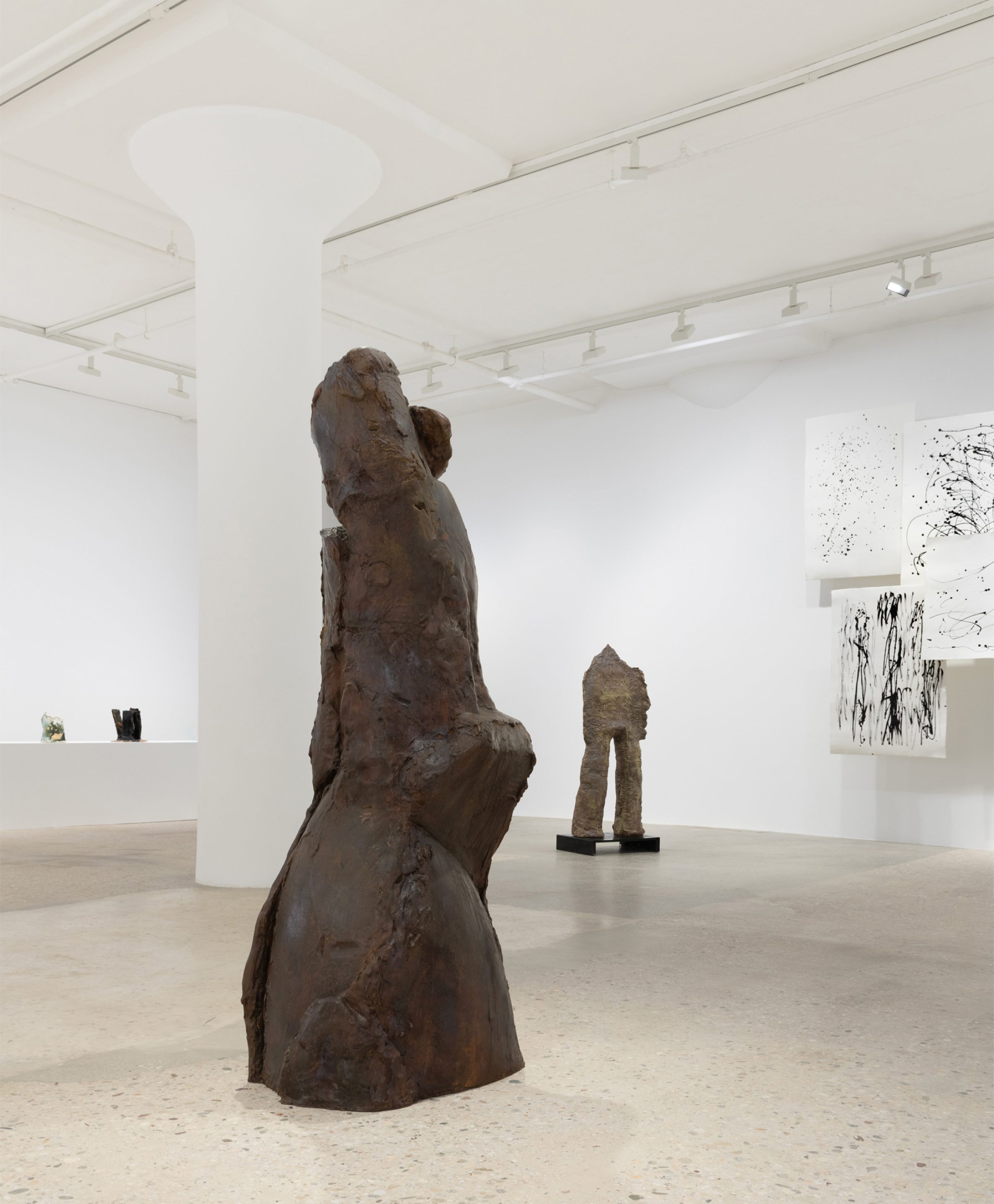 Known primarily as a sculptor of totemic works in clay and bronze, Fattal makes use of motifs that imply a cultural mix—from Sumerian tales to Sufi mysticism and pre-Islamic lore—that mirrors her own itinerant life, tapping into shared narratives of displacement and human resilience. Recurring forms include striding men on sturdy legs, suggesting archetypal heroes that endure through the ages. The bronze Walker, at kaufmann repetto, renders a life-size figure in motion, paired with a rock that trails it like a shadow. “Man is a standing animal,” Fattal has said of her prophets and wanderers. “Before he started thinking, he got up.” At Greene Naftali, Ghaylan and Mayya depicts seafaring lovers from Arabic literature, one splayed like a billowing sail—a material sleight-of-hand that uses the solidity of bronze to capture something as airy and impermanent as the wind. At the gallery’s center, the monumental bronze Tree likens organic growth to artistic creation, and the stoneware Humbaba from the Epic of Gilgamesh stands sentry, protecting a hand-drawn forest scrawled and dripped in skeins of ink.