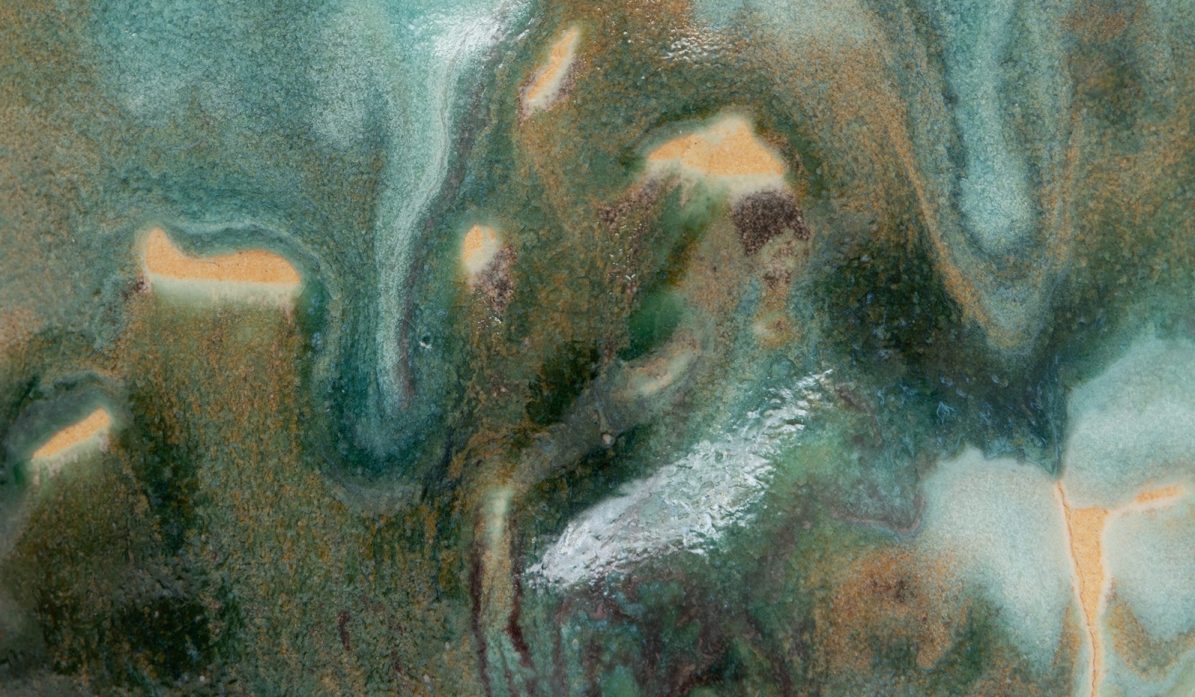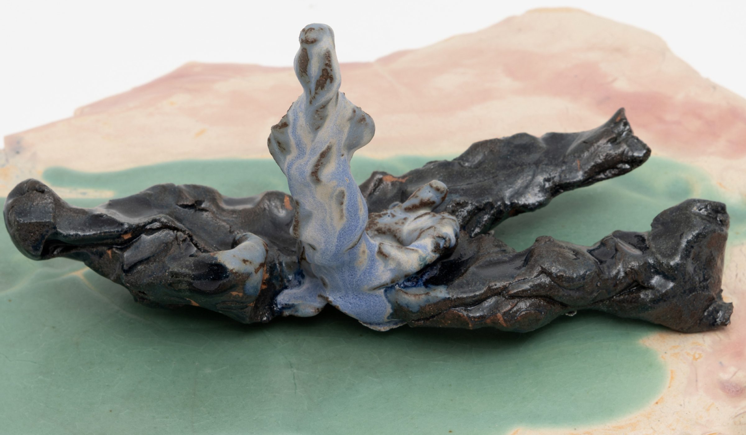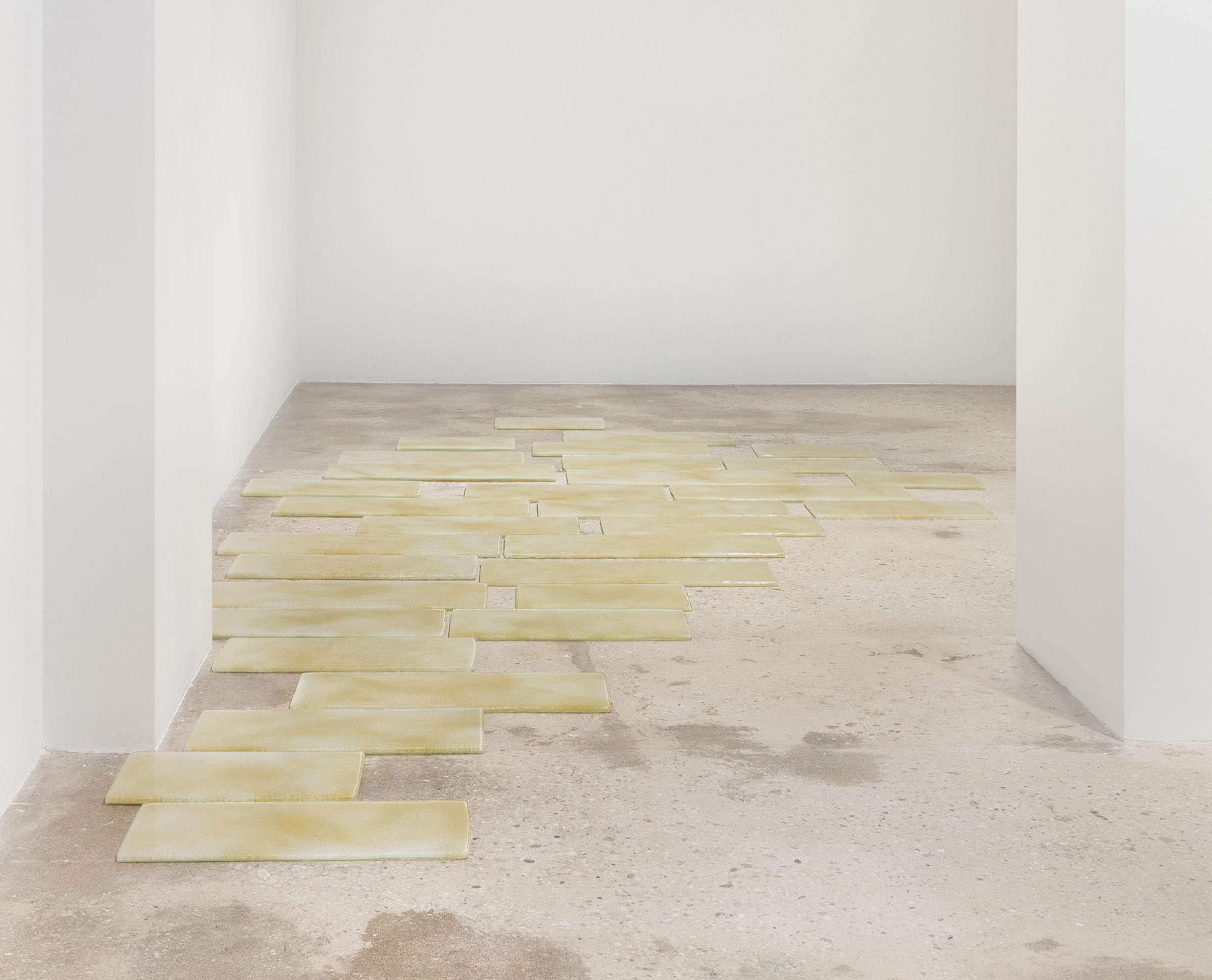Both exhibitions feature an array of tabletop ceramics that pay homage to the natural world, with glazed vignettes of plants and animals, a sand dune or an ocean wave. Other clay structures resemble humble dwellings or architectural ruins. These rough-hewn objects portray elemental forces and our means of shelter from them: the fundamental drive to make a home, to preserve what might otherwise be lost. The Primeval Forest and The Hearth consider the environmental relations of humans to their surroundings, with the Mediterranean as an abiding source of inspiration. In Golden Sea, a tessellated path of Murano glass tiles evokes a space of fluid circulation, while a series of collages picture sun on water from remnants saved over time and pieced together. Layered and nonlinear, collage is ideally suited to the multiplicity Fattal favors, with truncated forms that convey history’s ruptures as well as its affinities. “We do not and cannot have any real knowledge of the past,” Fattal has said. “We only have fragments.”