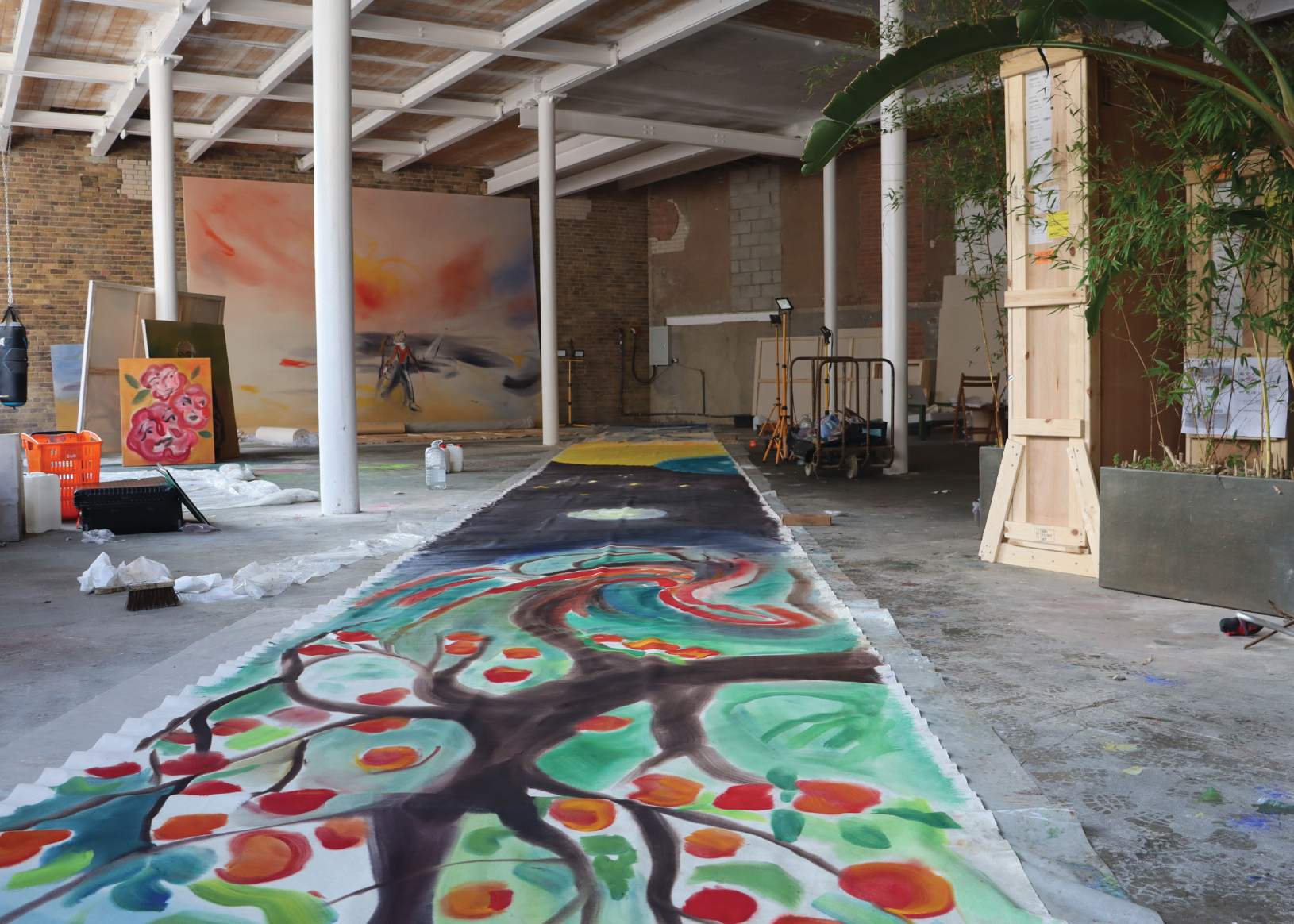 For Get Your Head Around It, Sophie von Hellermann has created a site-specific painting to be displayed within Kunsthalle Wien's 62-meter-long external display case on the museum's external façade. The exhibition is an homage to the writer, cyberneticist, linguist, and musician Oswald Wiener (born 1935, Vienna; died 2021, Styria), with whom von Hellermann studied at the Düsseldorf Art Academy.