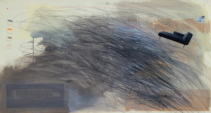 Jernigan’s drawings from this period frequently suggest the logic of a graph, visually plotting time and experience. The so-called “therapy drawings” diagram Jernigan’s 45-minute sessions with a therapist, denoting a color sample of the sofa, for example, the position of a Kleenex box, and weather patterns that suggest her mental landscape. In characteristic fashion Jernigan collected visual evidence, using a scientific method to draw out the affective registers of her life’s most mundane data.